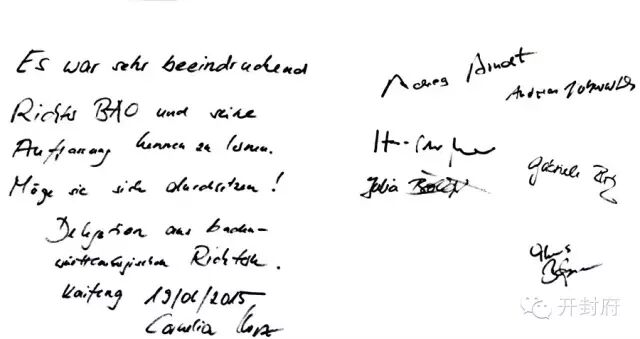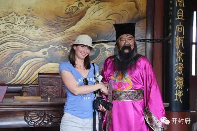 法官们走进古色古韵的开封府,听闻包公的故事不禁连连称赞,竖起了大拇指。在大堂上“包大人”赠送开封府特色礼物并与法官们并合影留念,科妮莉亚.霍尔茨代表法官访问团兴致勃勃的在开封府大堂上留言,其他法官也纷纷签名。