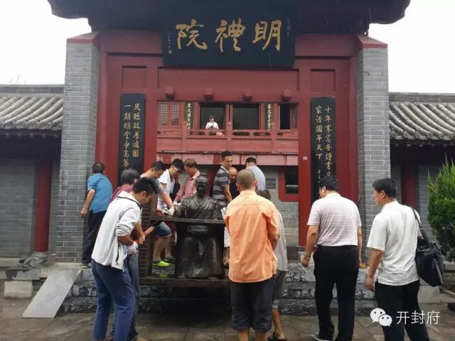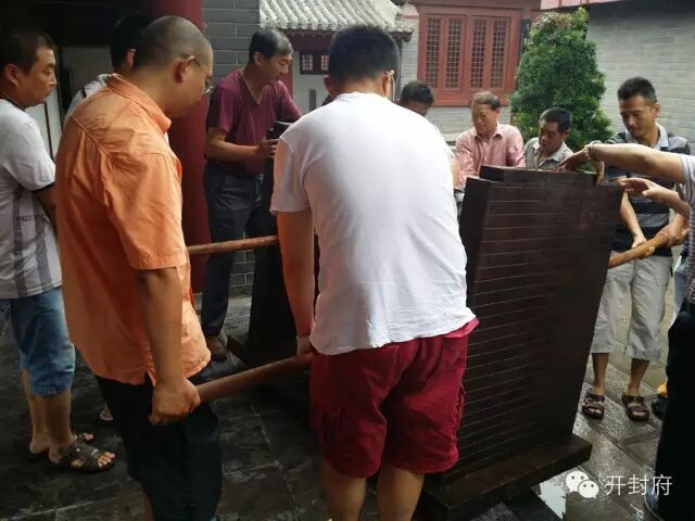近日开封府景区又多了一道历史风景,下着雨开封府的工作人员们非常辛苦努力的把铜像抬入明礼院内。