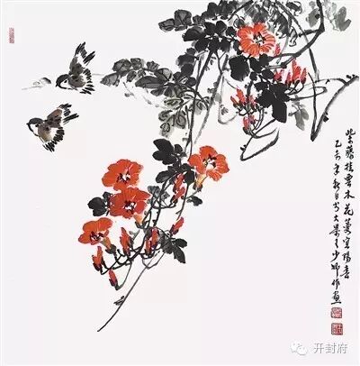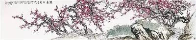 也许正是受到了梅花“唯有暗香来”的崇高品格和坚贞气节的感染,王少卿怀着良好的艺术感觉去创作这幅画。他将梅花与中华民族不屈不挠的品格和龙的传人之精神紧密结合,先是画出了石,然后再画出梅花的枝干,最后点染梅花。整幅作品利用国画小写意的创作手法,通过远近透视的方式找到画面平衡点,梅花和水仙设色淡雅,浓淡相宜,虚实相间,层次分明,疏密有致。而且,整个画面中的意境营造相当讲究:山石间有小溪环绕,远处有望不到头的想象空间,梅花的老干虬枝和大片的水仙花相映成趣,让人宛若置身其中,仿佛嗅到了来自大自然的阵阵幽香。题款中,“铁骨冰心”4个大字遒劲端庄,力透纸背。在其后用行书书写的王安石《梅花》诗:“墙角数枝梅,凌寒独自开,遥知不是雪,为有暗香来。”更展示了作者深厚的书法功底。整幅作品雅致大气,妙趣横生,浑然天成,大到整体构图,小到“春正浓”“留得春光”等几枚钤印所盖位置,都非常讲究。即便是这幅1.2米高、5米宽的作品,在纸张拼接上也是非常讲究的。画家巧妙地运用梅花的斜逸枝干进行两张宣纸的“无缝”对接,装裱好之后几乎看不出任何痕迹。王少卿向记者透露,郑州的一家高档宾馆曾经来人找到他,愿意出巨资让他创作一巨幅国画,后来因为尺幅太大不好创作,他婉言谢绝了。此次创作,虽然也是大幅作品而且难度不小,但想到是为开封的景区作画,展示的是开封厚重文化,他还是愉快地答应下来。对此次创作,他不但分文未取,而且格外用心。经过认真构思、悉心创作,他终于将这一巨幅画作展示在世人面前。他说:“这幅作品不仅仅是为开封府创作的,也是为开封旅游创作的;是画给今人欣赏的,也是让后人品评的。在我的古稀之年,能为开封旅游做一点贡献,为开封建设国际文化旅游名城尽一点力,我苦点累点,感觉值得!”