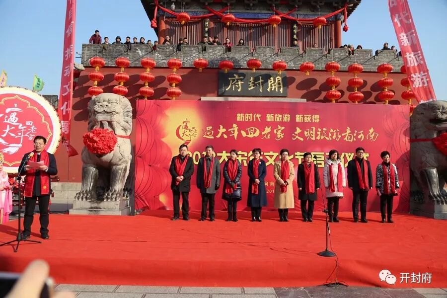 2018年2月6日上午十点,“过大年回老家 文明旅游看河南”暨2018大宋年文化节启动仪式在开封府景区府门广场正式开始。启动仪式由开封市人民政府副秘书长 王亚文 主持。到会人员有河南省旅游局副局长周耀霞女士、河南省文明办副主任葛卫华女士、开封市人民政府副市长孙晓红女士、河南省旅游局旅游促进处处长汤雁女士、河南省文明办志愿服务处处长高峰女士、河南省文明办创建处调研员赵鲁鹤先生、开封市市委宣传部副部长市文明办主任何利军先生、开封市旅游委主任薛冬女士、开封市开封府旅游开发有限公司董事长段朝现先生。