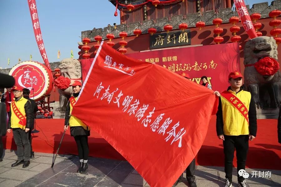 河南省文明办副主任葛卫华女士授“河南省文明旅游志愿者服务队”旗帜,开封最美导游员孙璐接旗