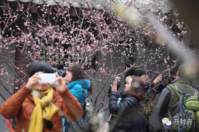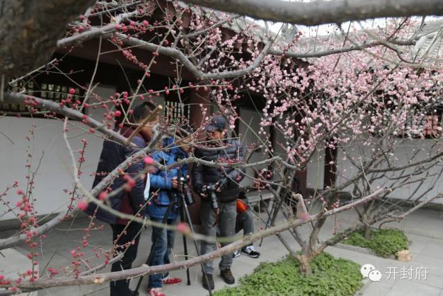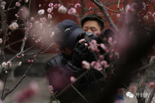 天气渐渐回暖,开封府内充满着梅花的清香,满园春色,开满了红粉色的梅花,红色灿如云霞,粉色如描似画,充满着生机,令人赏心悦目,吸引了不少来自四面八方的游客,各路游客走在开封府内欣赏着梅花更能体会古人的心情和包公如梅花一样坚贞、不屈荣利的品质精神。也吸引了众多的摄影爱好者来到开封府内拍摄,他们用手中的相机去发现记录梅花的品质与美。