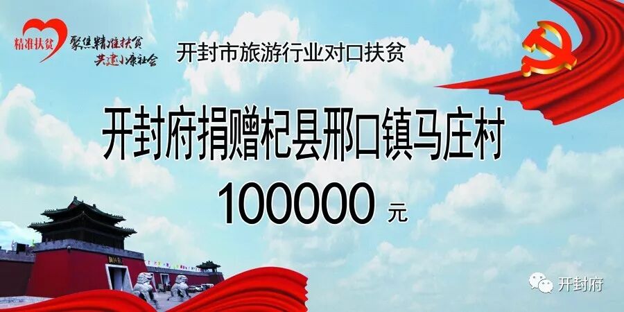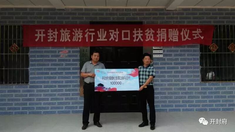 开封府景区积极响应市旅游委开展的“开封市旅游行业对口扶贫捐赠活动”,景区董事长段朝现带领副总经理修振明和办公室工作人员一行,赴杞县邢口镇马庄村参加了市旅游行业对口扶贫捐赠仪式,并向马庄村的文化广场建设项目捐赠人民币10万元。