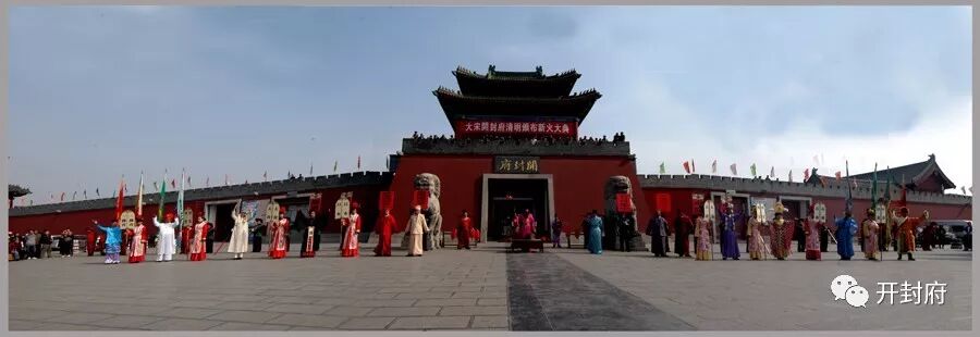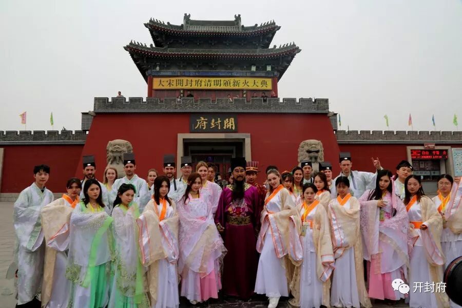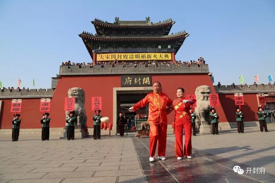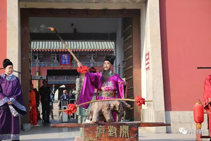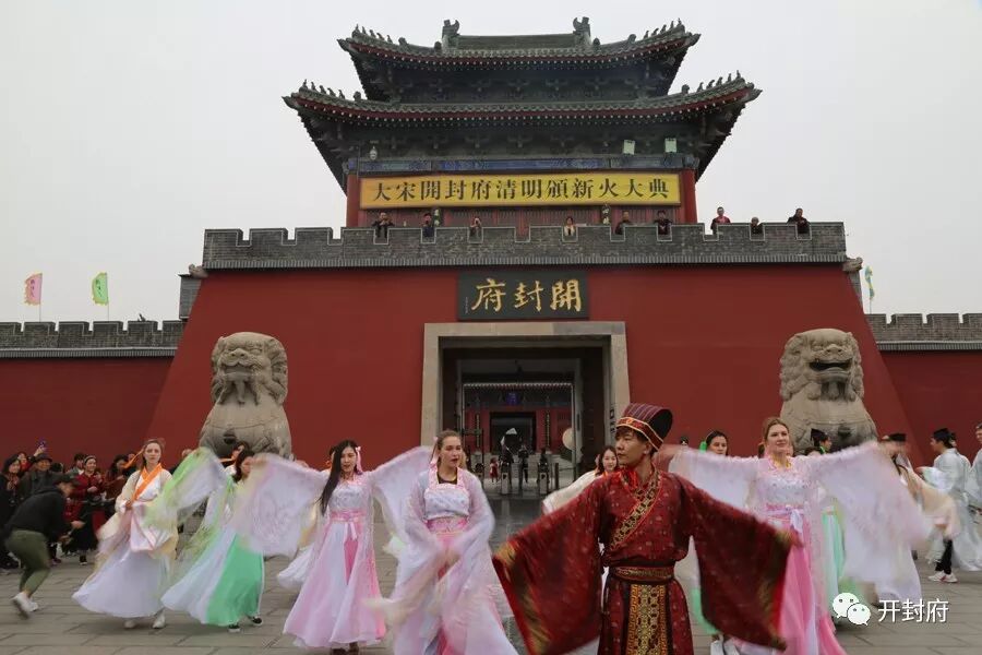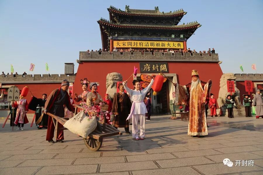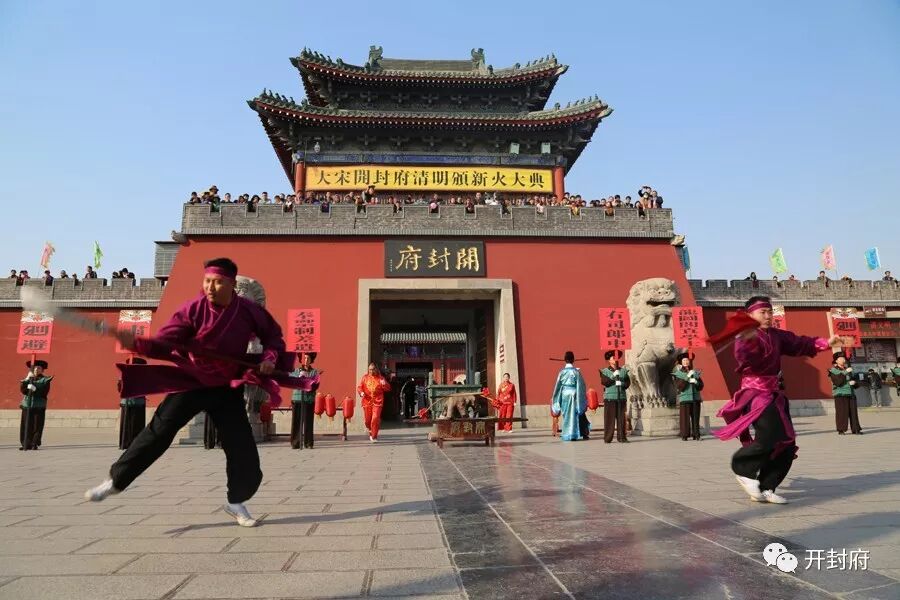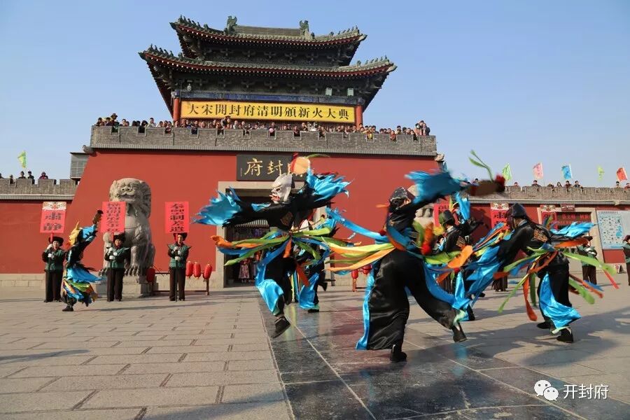 在2019中国(开封)清明文化节踏春大巡游的终点站——开封府府门广场上,大型实景剧“大宋开封府清明颁新火大典”隆重举行。演出再现了北宋开封府在清明节,包拯携属官、众衙役执燧取火,向京城十厢128坊的百姓、藩国朝贡使臣、外国贡使“颁新火”这一历史风俗。整场演出20分钟,演员阵容近百人,已成为中国(开封)清明文化节的一个重要组成部分,演出将持续到4月10日,每天早上9点准时与广大游客见面。