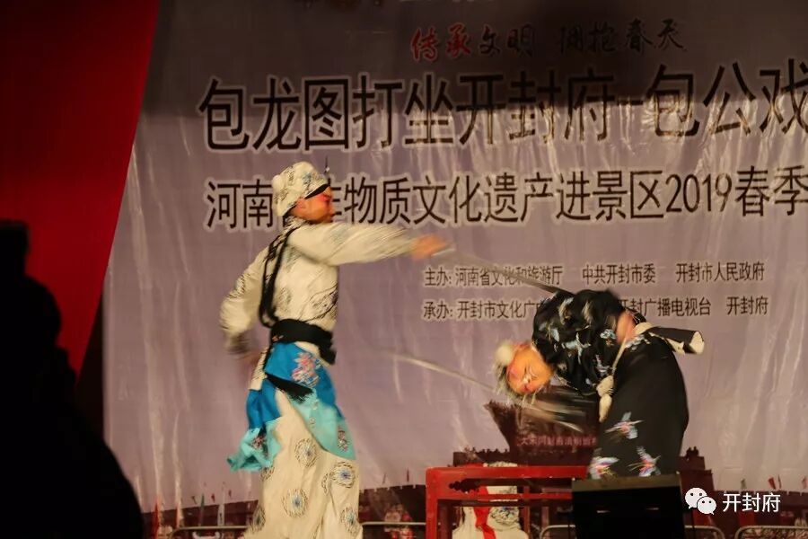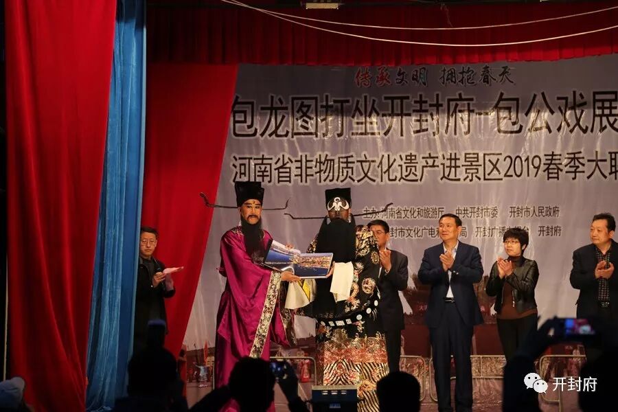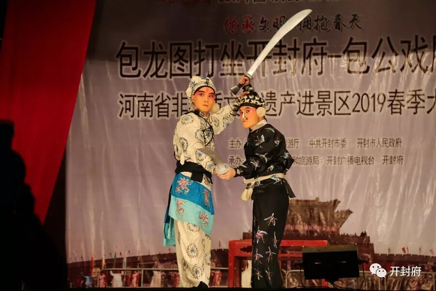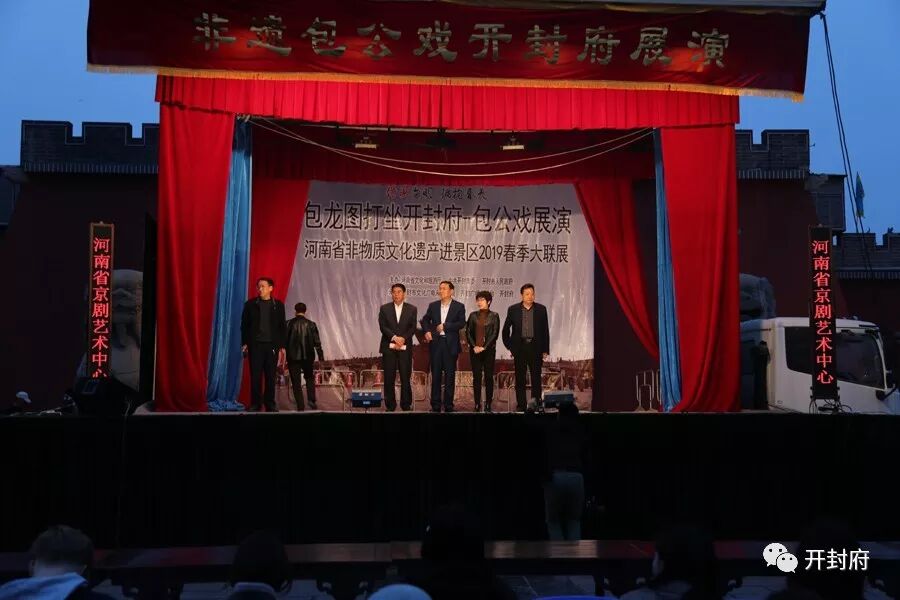 晚上,作为“河南省非物质文化遗产进景区2019春季大联展”的重头戏,包龙图打坐开封府——包公戏展演活动在开封府府门广场举行。开封市副市长郑中华、文广旅游局局长魏培仕、副局长郑秋申、省京剧院院长赵丽、开封府董事长段朝现出席了开幕式。开幕式后,众多市民及游客欣赏了由省京剧艺术中心带来的《遇皇后》、《打龙袍》二剧联演及《三岔口》选段。精彩的剧情、精湛的演出,赢得现场观众阵阵掌声。此次展演将进行5天,每晚7点在开封府府门广场由非遗剧团带来传统包公剧目。