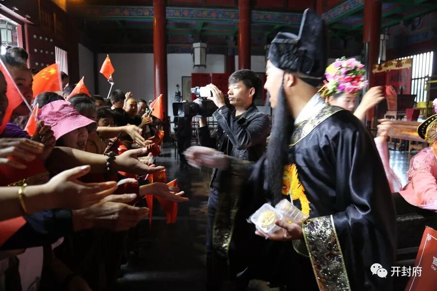 包大人在开封府大堂前,为大家送去祝福奉上中秋月饼。