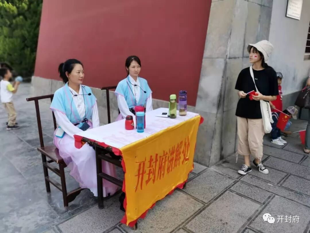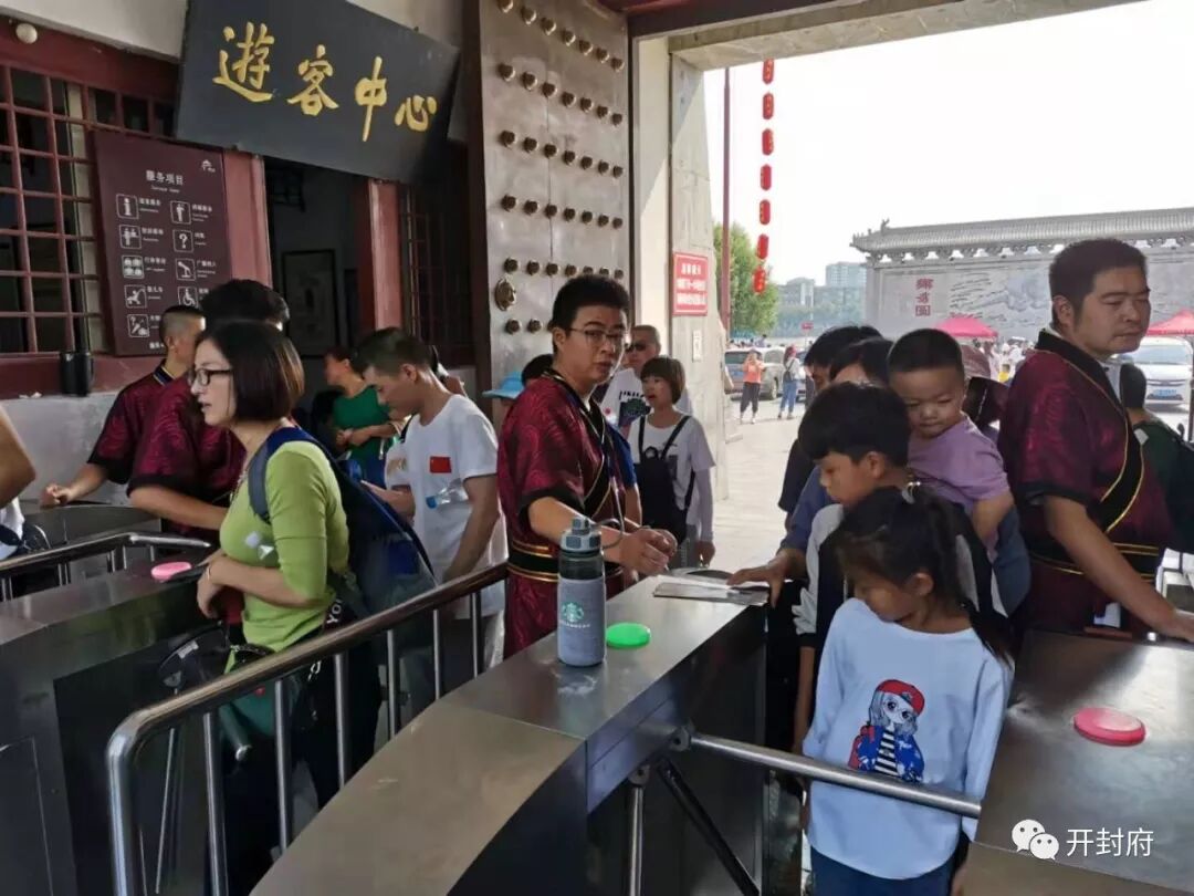 午后开封府游客量大幅增加,景区内人潮涌动。在整个国庆假期我们将为来自各地的游客奉上全天十三场精彩的演出。景区工作人员全员上岗,工作时间从早七点至晚七点,同时增加景区出入口、增开购票窗口、开设网络购票绿色通道。