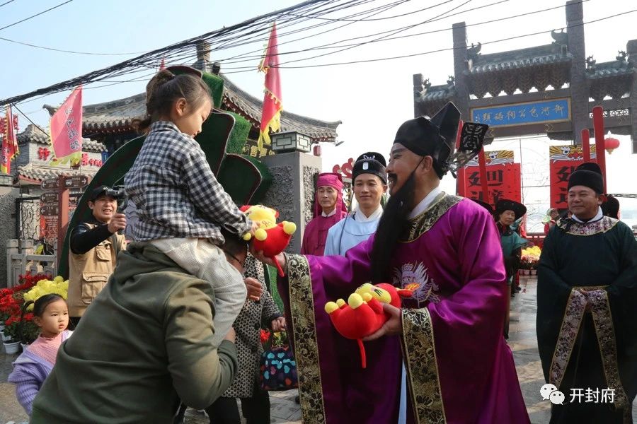 在开封府码头和包公祠码头,游客们看到“包大人”纷纷上前合影留念,“包大人”也给各位游客送上祝福及小礼物。